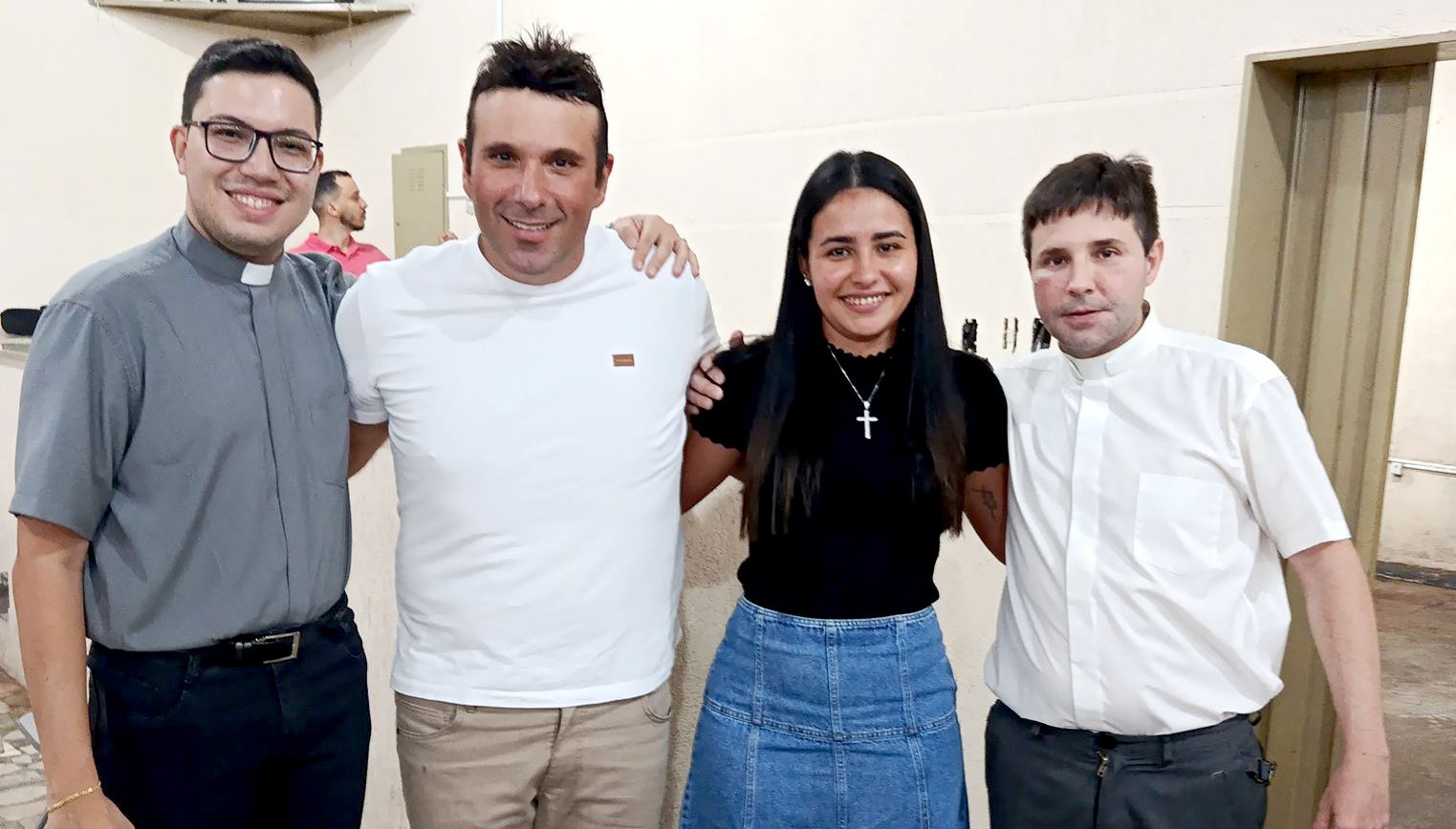 O prefeito Ricardo Robles e a primeira-dama Cleide Bastos na recepção ao padre Bruno Cardoso (à esquerda), que em janeiro assumiu a função de vigário da Paróquia São José, ao lado de padre Mateus (à direita). Padre Bruno foi ordenado no dia 28 de novembro do ano passado e dá início ao primeiro trabalho dele