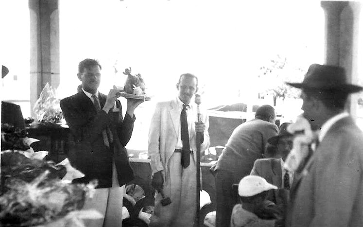 Leitoooa – O leiloeiro Arnaldo Camargo canta a prenda em dia de quermesse de São João, no coreto – enquanto o professor Henrique Scabelo apresenta o assado ao público