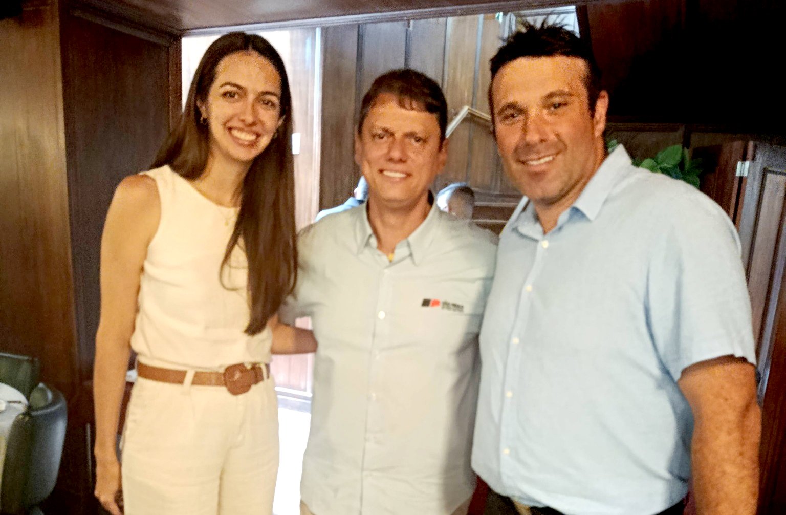 Foto: Divulgação O governador Tarcísio de Freitas entre a coordenadora de Saúde de Adolfo, Márcia Fernanda Chagas, e o prefeito Ricardo Robles, durante encontro em Itu, quando Adolfo recebeu mais um veículo destinado a transporte de pacientes