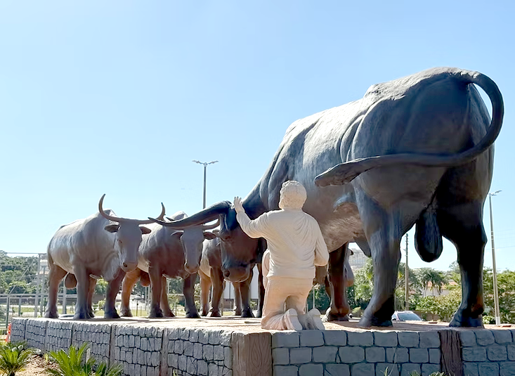 Monumento ao Boi Soberano, no Parque dos Lagos, em Barretos: A canção conta a emocionante história de um estouro de boiada, em que uma criança cai no caminho dos bois. O pai clama a Deus, e, milagrosamente, o boi mais bravo do rebanho protege a criança ao invés de feri-la. É uma narrativa que mistura religiosidade, natureza e a vida simples do interior. Foto: Divulgação